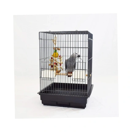 Esta es una jaula pensada para un loro pequeño que ocupa un espacio reducido, con bandeja en la parte inferior
