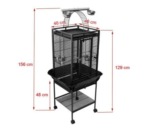 Esta jaula es el hermano pequeño de una de mayores dimensiones. Su altura es de 1.29 m y tiene una base de 46 cm. Es una pajarera para un solo loro para aquellos casos que no dispongan de mucho espacio. Tiene acabados en ángulo recto y es moderna.